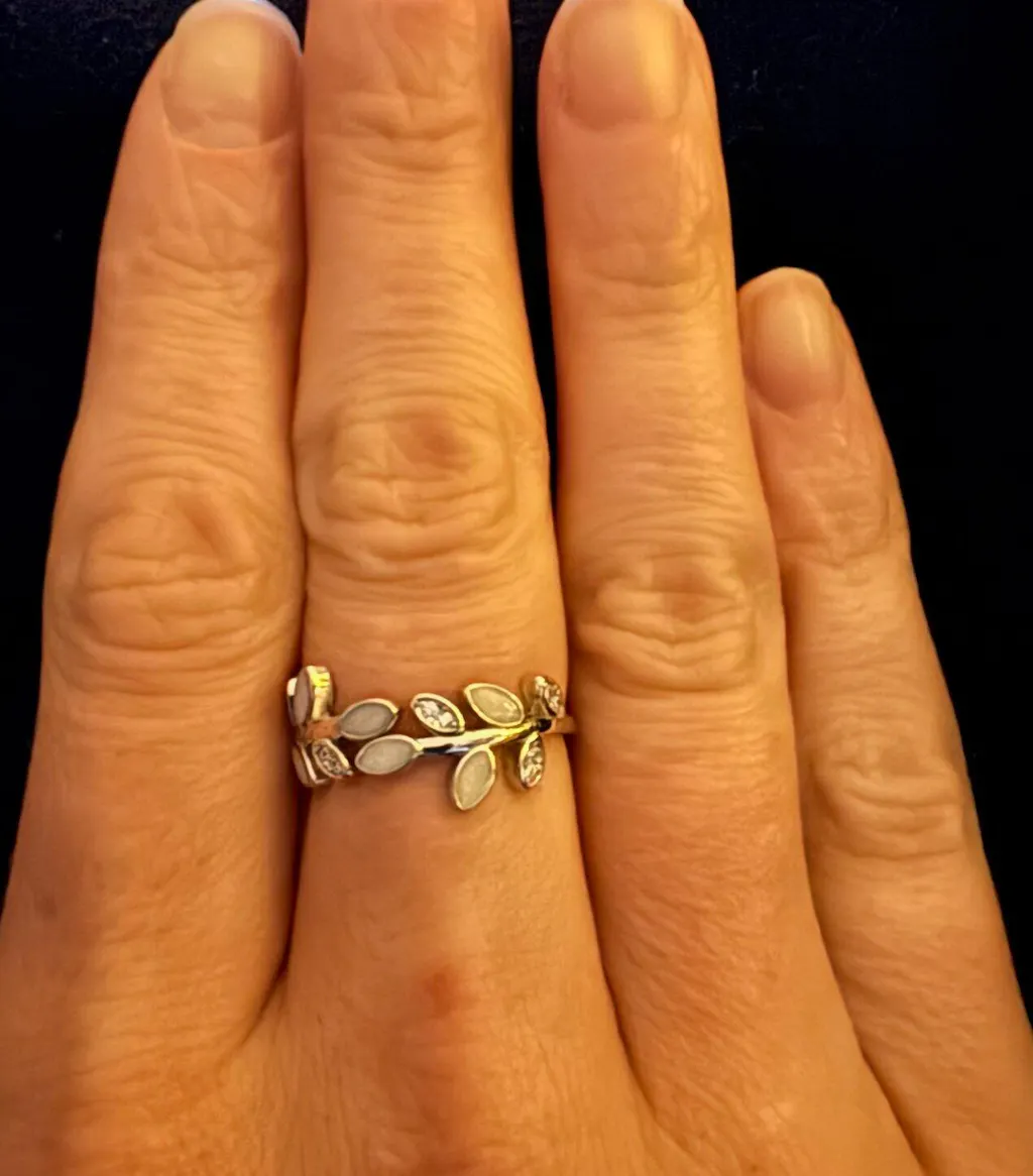 Our Ivy Sparkle is inclusive of six delicate milkstones on a open adjustable band. Available in 925 Silver plated with white gold or 14k solid gold.